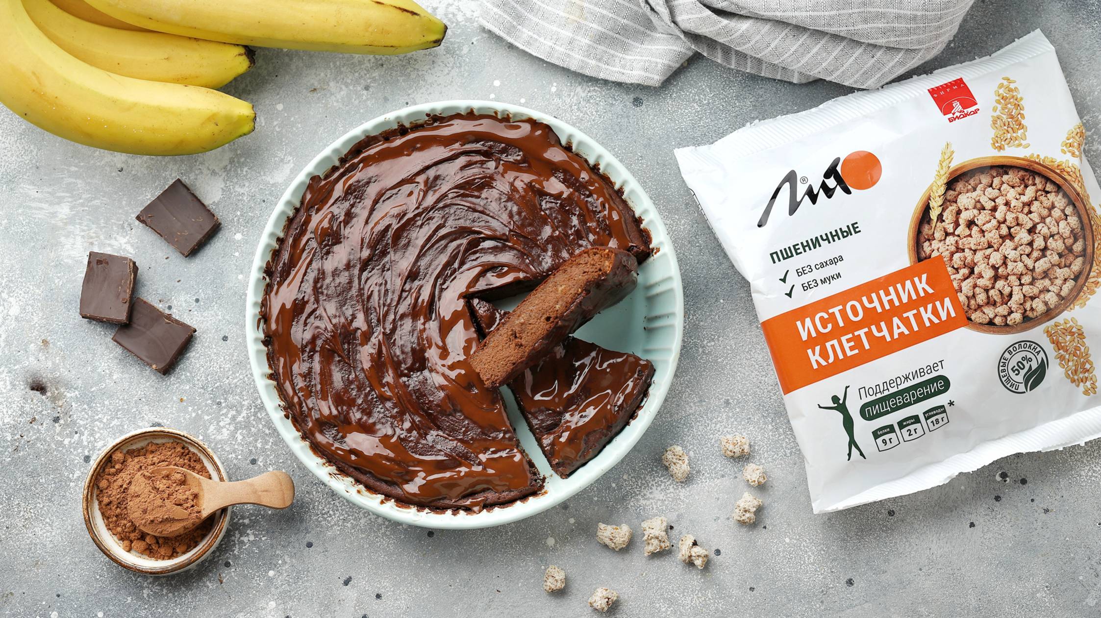 Шоколадно-банановый пирог с отрубями без муки и сахара