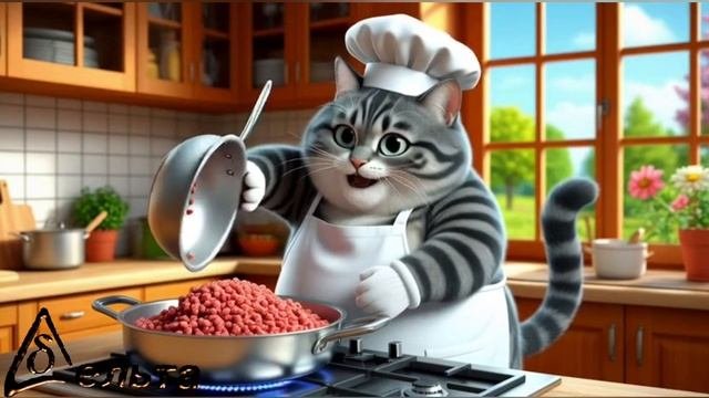 Весёлый котик показывает как готовить используя реальные рецепты. Qr code с полным рецептом приготовления в конце.