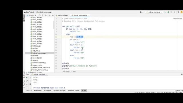 A simple program that I wrote to solve ordinal numbers using Python programming language. I am currently accepting programming work, IT projects, school and application development, programming projects, thesis and capstone projects, IT consulting work, computer tutorials, and web development work kindly contact me at the following email address for further details. If you want to advertise on my website kindly contact me also in my email address also. Thank you. My email address is the following [email protected], [email protected], and [email protected]. My mobile number here in the Philippines is 09173084360. My telephone number at home here in Bacolod City, Negros Occidental Philippines is +63 (034) 4335675. Here in Bacolod City I also accepting computer repair, networking, and Arduino Project development at a very affordable price. My website is www.jakerpomperada.blogspot.com and www.jakerpomperada.com If you like this video please click the LIKE button, SHARE, and SUBSCRIBE to my channel. Your support on my channel is highly appreciated. #python #pycharm #pythonprogramming #programming #coding #jakepomperada #philippines #freecodes