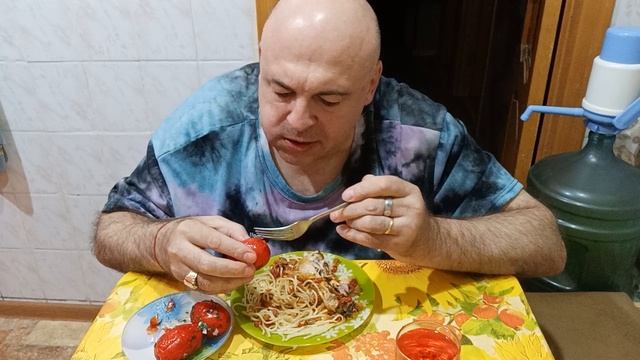 Мукбанг. Чахохбили со спагетти, малосольные помидоры и морс. Просто говорю.