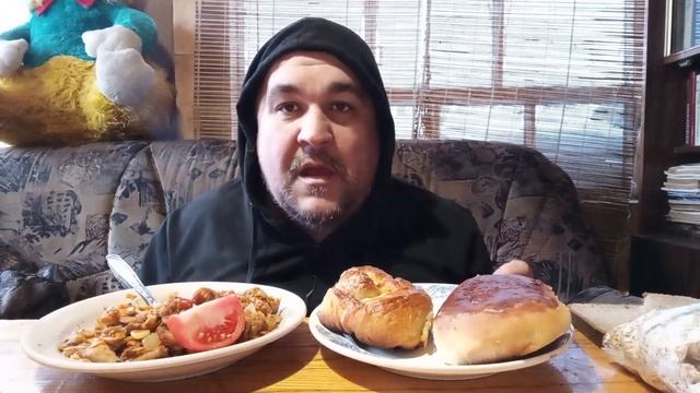 домашний мукбанг - жареное мясо с овощами, пирожок с капустой и плюшка