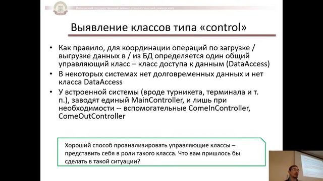 Анализ 00:00 Введение 00:30 Рабочий поток анализа 01:50 Аналитическая модель. Правила 06:25 Артефакты анализа 08:17 Детализация рабочего потока анализа 09:21 Выявление классов анализа 10:35 Что такое классы анализа 11:47 Анатомия класса анализа 14:26 Признаки хорошего класса анализа 17:18 Признаки плохого класса анализа 20:01 Методы выявления классов 20:57 Анализ существительное / глагол 25:05 CRC-анализ 29:03 Применение стереотипов RUP 41:29 Категории концептуальных классов 45:09 Существующие модели 47:15 Выделение ассоциаций 50:32 Составление набора ключевых абстракций 52.38 Реализация вариантов использования 59.13 Элементы реализации вариантов использования 1:01:55 Порядок анализа вариантов использования 1:09:14 Системная диаграмма последовательностей