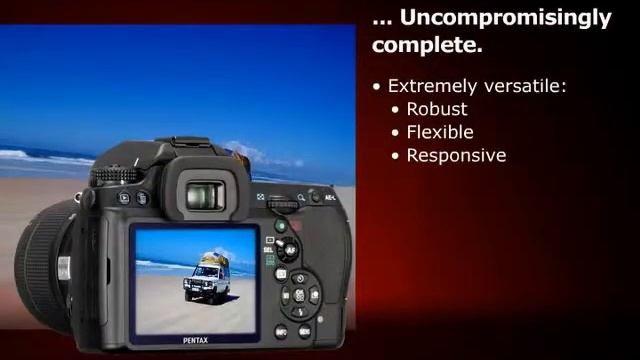 Pokročilá verze zrcadlovky Pentax K7 se snímačem CMOS 15MPix, zvýšená odolnost vůči povětrnostním vlivům, 77 segmentové měření expozice, 1/8000s, antiprachová ochrana čipu, živý náhled, rozpoznání obličeje a HD video, HDMI.