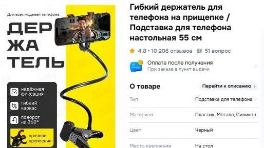 Гибкий держатель для телефона на прищепке / Подставка для телефона настольная 55 см с ozon доставка Почта России Артикул: 1558181565