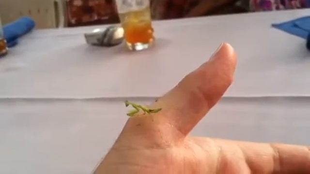We went to a Luau, and this baby praying mantis kept crawling on me. As the drums started playing, I noticed that he was dancing in sync.