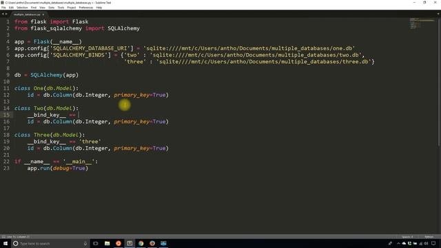 In this video I show you how to use multiple databases in Flask-SQLAlchemy using binds. As you'll see in the video, it's as simple as adding more configuration and then adding a bind key to each table. If you have separate databases for thing like app configuration and users, then this video will be perfect for you. Need one-on-one help with your project? I can help through my coaching program. Learn more here: https://prettyprinted.com/coaching Join my free course on the basics of Flask-SQLAlchemy: https://prettyprinted.com/flasksql Multiple database with binds documentation: http://flask-sqlalchemy.pocoo.org/2.1/binds/ Flask-User templates: https://github.com/lingthio/Flask-User/tree/master/flask_user/templates/flask_user Get the Flask cheat sheet here: https://prettyprinted.com/flaskcheatsheet