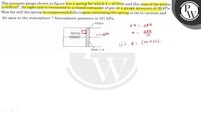 The pressure gauge shown in figure has a spring for which \( k=60 \mathrm{~N} / \mathrm{m} \) and the area of the piston is \( 0.50 \mathrm{~cm}^{2} \). Its right end is connected to a closed container of gas at a gauge pressure of \( 30 \mathrm{kPa} \). How far will the spring be compressed if the region containing the spring is (a) in vacuum and (b) open to the atmosphere? Atmospheric pressure is \( 101 \mathrm{kPa} \). 📲PW App Link - https://bit.ly/YTAI_PWAP 🌐PW Website - https://www.pw.live