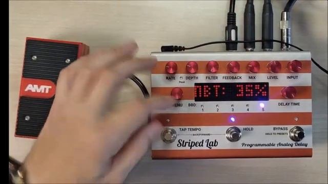 Striped Lab Programmable Analog Delay part 2. - Построен на 5-ти чипах V3205SD; - Имеет самое чистое звучание среди всех аналоговых дилеев. - До 1500 ms времени задержки; - Имеет 100% аналоговый тракт; - Использование усилителей управляемых напряжением VCA, работающих в "Class-А"; - Сохранение до 10 пользовательских пресетов; - Управление по MIDI интерфейсу; - Стерео выход; - Управление педалью экспрессии.