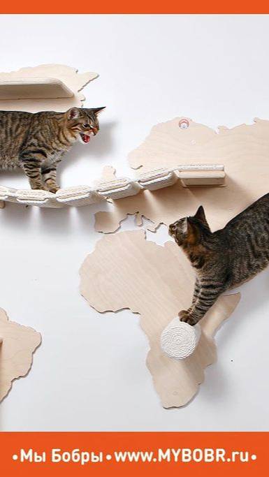 Можно ли путешествовать по странам и континентам, не выходя из дома? Люди это делают, исследуя просторы интернета или сидя перед телевизором. А Хитрые и Умные Коты – используя игровой настенный комплекс «Карта мира». Так они не только совершают перемещения по всей планете, но и как следует разминают свои упругие мышцы, оттачивают острые коготки, а кое-где и как следует отсыпаются. Поточить когти в Южной Америке, в три прыжка преодолеть расстояние между Австралией, Африкой и Азией, перебежать по мостику из Европы в Северную Америку и впасть в зимнюю спячку прямо в Сибири – все это позволяет наш комплекс для кошек «Карта мира». Для его изготовления мы использовали березовую фанеру – просто и экологично. Когтеточки и круглые ступеньки обмотали прочным хлопковым шнуром, а для гамака взяли мягкий и нежный флис, который так легко стирать в машинке. Вы можете купить настенный комплекс для кошек «Карта мира» в базовом варианте или заказать покрытие акриловым тонированным матовым лаком любого цвета, а также выбрать цвет гамака по вашему вкусу. Мы поставляем комплекс в полной сборке или в виде комплекта деталей с подробной и понятной инструкцией по сборке и монтажу. Всё необходимое для крепления к стене входит в комплект. Высота комплекса 140 см, длина 250 см, вес 22 кг