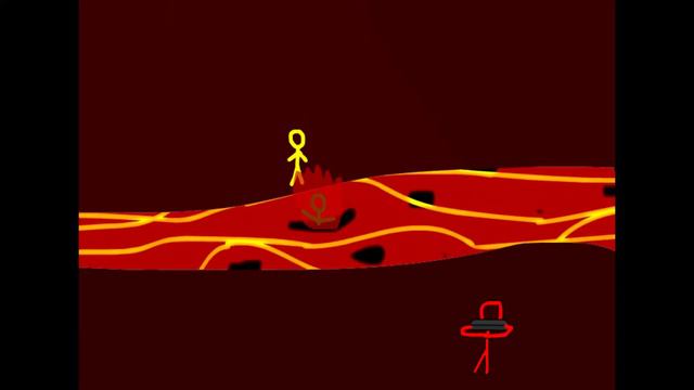 A Yellow guy kicks a Green guy into lava while a Red guy plays harmonica