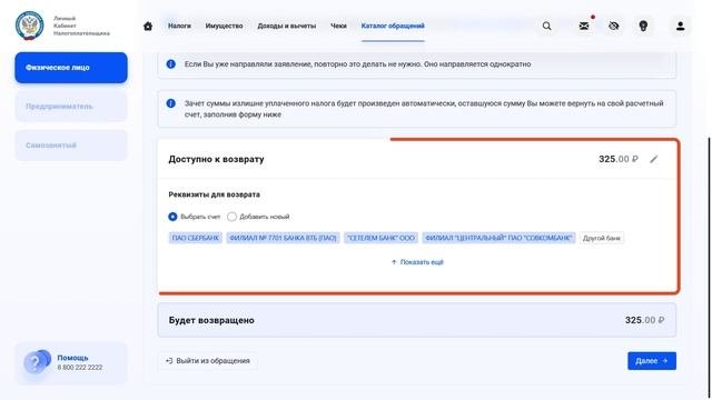 ЛК ФЛ возврат переплаты по ЕНС