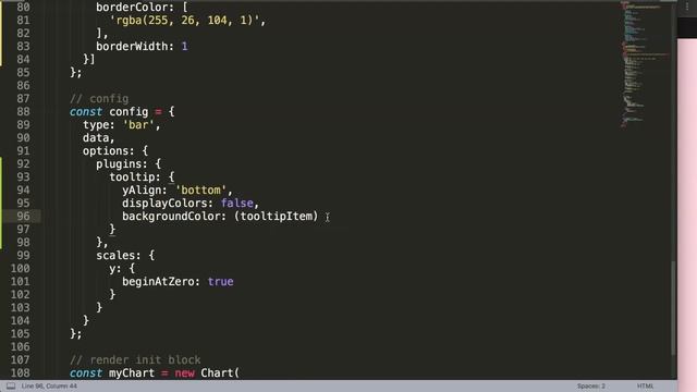 How to Color Tooltip Based on Bar Color with multiple datasets in Chart js In this video we will explore how to color tooltip based on bar color with multiple datasets in chart js. With Chart js using colors in the tooltip can be useful. Instead of displaying color boxes you might want to adjust the background color of the tooltip with matching colors. We will make the color of the tooltip dynamic based on the bar colors. It changes automatically depending on the bar we mouseover. Let's explore this right now! ▬ Chartjs Viewers Question Series ▬▬▬▬▬▬▬▬▬▬ This is part of the Chartjs Viewers Question series. Where we answer viewer questions. This question was asked by one of our viewers. A special thank you to MAURO DANIEL MEZA ZAMORA for asking this question here: https://youtu.be/UxJ5d-HGhJA ▬ Materials/References ▬▬▬▬▬▬▬▬▬▬ To keep the video short we might expect you to know parts. These parts we have explained in other videos. You can find the references here below: Understand setup, config and render init blocks: https://youtu.be/pFuibt5HNog Starting Code: https://www.chartjs3.com/docs/chart/getting-started/ ▬ Got a Question? Comment! ▬▬▬▬▬▬▬▬▬▬ Got a question or special request about a specific item? Comment below and tell me your question. I will make sure to follow up on you! ▬ Find Me Here ▬▬▬▬▬▬▬▬▬▬ Blog: https://www.chartjs3.com/chart-js-blog/ Website: https://www.chartjs3.com Udemy Course: https://www.udemy.com/course/chart-js/?referralCode=56B57F673E9D41FF4AD2 Chart JS tutorials for Beginners: ? Beginners Serie: https://www.youtube.com/watch?v=W6ai7wu5VIk Chart JS tutorials for Intermediate: ?️ Most Watched Chart JS Video: https://www.youtube.com/watch?v=4jfcxxTT8H0 ⭐ Personal Favorite Chart JS Video: https://www.youtube.com/watch?v=PuFYW1yHzl4 Chart JS Dashboard Series: ? Most Liked Video Series: Watch Part 1: https://youtu.be/l3MnVpiHXBU Watch Part 2: https://youtu.be/fDUo-LbrRSo Watch Part 3: https://youtu.be/xlt5dDa8rz4 ▬ About Us ▬▬▬▬▬▬▬▬▬▬▬▬ Why we created these #chartjs and #javascript video tutorials? WHY Creating charts in javascript is very rewarding but extremely challenging. The Chart JS library made it easier to render charts. However the chart js documentation is hard to understand for many. It requires a lot of different moving parts to work along. The canvas tag, javascript, arrays and Chart JS all need to be combined to draw an eye catching bar chart or line chart. The videos explains the chart js documentation in a more visual and easy to understand way. You can follow along with the code and quickly grasp how it works. We cover the code in chart js but also what truly happens and why something happens when we write a line of code. This fundamental understanding gives clarity to you as a developer in chartjs. In short it is the Chart JS video documentation. HOW We answer questions from YOU (viewers) by creating an answer video that covers the questions YOU have posted in the comment section. WHAT Our goal is to help YOU learn how to draw charts in Chart JS by showing you in video format how to do it. Chart JS Video Documentation Site: https://www.chartjs3.com ▬ Chart JS 3.7.0 ▬▬▬▬▬▬▬▬▬▬▬▬ Chart JS is a javascript library to draw charts in the canvas tag on your site. Presenting data in a visual manner such as charts is more effective and appealing. All the charts are always coded in the latest Chartjs version which is as of this recording Chart JS 3.7.0. What type of charts can you make with Chart.JS? With chart js you can make line chart, bar chart, pie chart, doughnut chart, scatter chart, polar area chart, radar chart, gauge chart and area chart. And with some clever tricks and visual adjustment more can be done.