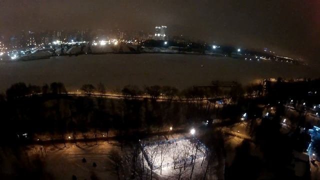 Полет на коптере над парком Северное Тушино в новогоднюю ночь 2017. К сожалению, параллельное исполнение обязанностей контроля за двумя сорванцами не позволило ни полноценно полетать с ФПВ, ни во-время попасть на новогодний фейрверк. Летал в районе двух часов ночи, без ФПВ-канала, поэтому над людьми старался не летать.