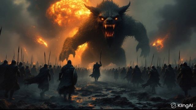 Орда воинов в темных доспехах, видимых сзади под низким углом, стоит в строю на пустынном, грязном поле боя под огненным, задымленным небом. Вдалеке над ними возвышается огромный, чудовищный зверь с горящими красными глазами и острыми зубами, его силуэт четко вырисовывается на фоне мощного взрыва огня. Воины несут копья и щиты, их силуэты мрачны и решительны. Местность неровная и бесплодная, что усиливает ощущение отчаянной, эпической битвы. Камера подчеркивает ошеломляющие масштабы монстра. #орда #воины #битва #сражение #оборотень #монстр