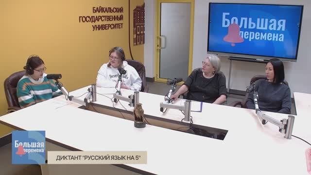 В сегодняшнем выпуске программы "Большая перемена" мы поговорили о том, что объединяет нас, формирует нашу культуру и позволяет понимать друг друга – о русском языке! Мастерству выражать свои мысли письменно и без ошибок посвятили недавнее событие в Байкальском университете – диктант "Русский язык на 5". Подробнее о нём рассказали Светлана Карамышева, кандидат педагогических наук, доцент кафедры русского языка и межкультурной коммуникации БГУ, и Екатерина Непомнящих, кандидат филологических наук, доцент кафедры русского языка и межкультурной коммуникации БГУ. Ведущие — Екатерина Хохрякова и Дарья Терехина.