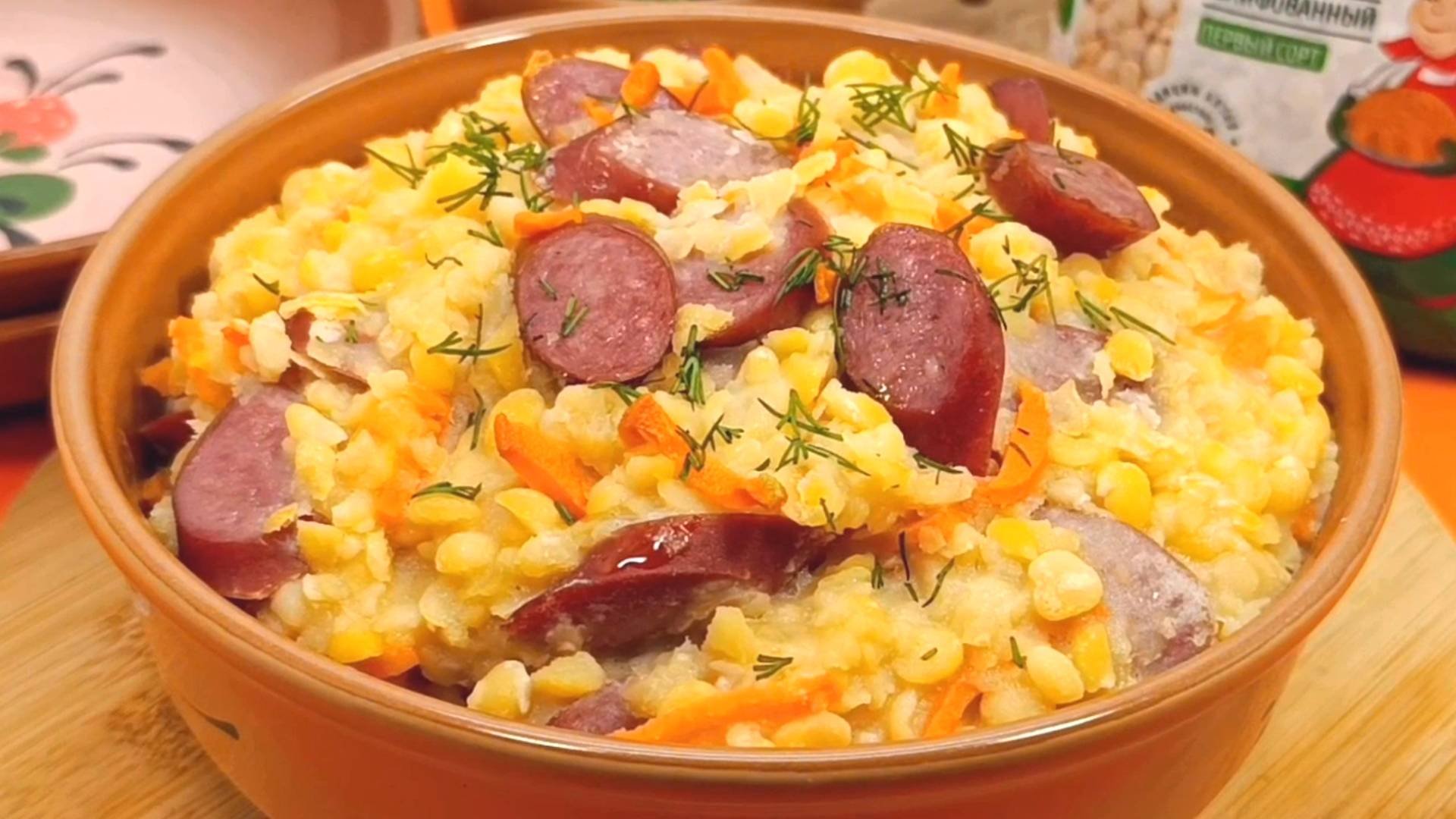 Готовим очень вкусное блюдо — горошницу с ароматными копчеными охотничьим колбасками. Здравствуйте дорогие друзья! Сегодня мы с вами приготовим очень вкусное блюдо — горошницу с ароматными копчеными охотничьим колбасками. Время приготовления: 2 часа. Ингредиенты: 800 мл воды, 200 г колотого гороха ТМ «Алейка», от щедрых полей Алтая, 3 копченых охотничьи колбаски, 3 ст. ложки натурального подсолнечного масла ТМ «Алейка», 1 луковица, 1 морковь, 1 веточка укропа, 1/2 чайной ложки соли, 1 щепотка черного молотого перца. Приготовление: 1. 200 грамм колотого гороха ТМ «Алейка» выложить в большую миску. Залить холодной водой и оставить на 1 час. 2. Набухший горох хорошо перемешать. 3. Откинуть на дуршлаг и промыть проточной водой. 4. Переложить горох в кастрюлю. Влить 800 миллилитров воды и варить до закипания. 5. Снять пену. Убавить огонь на минимум и варить 40 минут до готовности. 6. Луковицу мелко нашинковать. Морковь нарезать ломтиками, а затем нарезать брусочками. 7. Три копченые охотничьи колбаски нарезать ломтиками. 8. На сковороде разогреть 3 столовые ложки натурального подсолнечного масла ТМ «Алейка». 9. Выложить в сковороду лук и морковь. Обжарить, помешивая, 3-4 минуты. Добавить охотничьи колбаски и готовить 2-3 минуты. 10. В готовый горох добавить 1/2 чайной ложки соли и 1 щепотку черного молотого перца. Перемешать. 11. Добавить обжаренные овощи и колбаски. Перемешать, оставить на медленном огне на 2-3 минуты. 12. Выложить горошницу на блюдо. Добавить мелко нашинкованной зелени укропа. 13. Горошница с колбасками готова. Можно подавать к столу. Приятного аппетита!