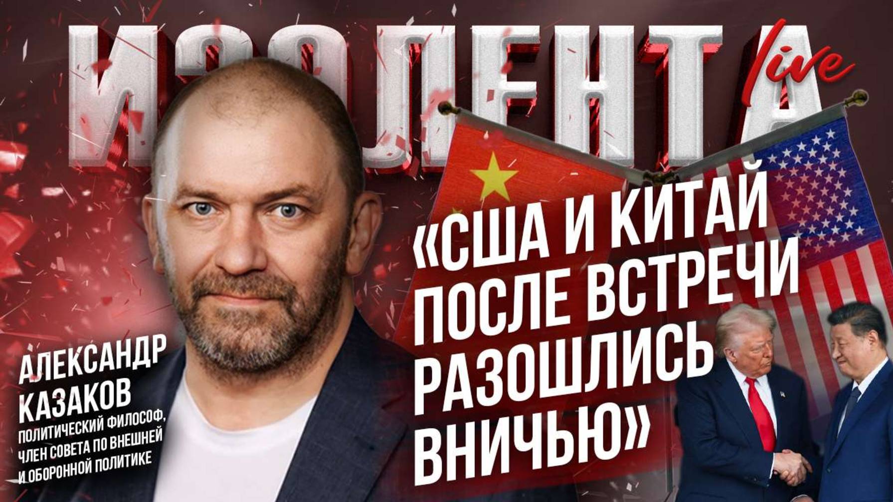 Смог ли Трамп достичь своих целей в ходе азиатского турне? Способны ли американские пошлины напугать председателя КНР Си Цзиньпина? Удалось ли Трампу сохранить лицо на встрече с Си? Какова судьба Европы на фоне сближения отношений России, Китая и Индии? Зачем лидеры бывших советских республик едут в Вашингтон? Турне Трампа по странам Азии обсудили в эфире «ИзолентаLive» с политическим философом, членом Совета по внешней и оборонной политике, экспертом Народного фронта Александром Казаковым. Александр Казаков: https://t.me/ale_kazakov Дмитрий Захаров: https://t.me/bruce_underground Пётр Лидов: https://t.me/pvsgns Трофим Татаренков: https://t.me/NeBrigada Задонатить, участвовать в голосовании и задать вопрос можно тут: https://donate.stream/izolentalive. Нравятся наши выпуски? Подпишись на «Изолента+»: https://t.me/tribute/app?startapp=sr3 Изолента в Телегам https://t.me/izolentalive Изолента ВКонтакте https://vk.com/izolentalive Изолента в Одноклассниках: https://ok.ru/group/70000002758400 Кулинарный проект "Мужики на кухне": https://t.me/tribute/app?startapp=si76 Радио Sputnik: https://t.me/radio_sputnik «ИзоТОЛК» — это новый проект «ИзолентаLive» и «Изолента+»! Есть что сказать? Оставь заявку здесь: https://t.me/IzoTalkBot. Книга Трофима «Темник», как говорят злые языки, главная книга года. Купить её можно тут: https://litgid.com/catalog/sovremennaya_proza/temnik/
