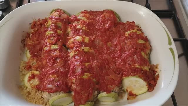 Телеграмм (telegram) https://t.me/cookingwithLOVE1 VK сообщество: https://vk.com/club225549357 ГОТОВИМ С ЛЮБОВЬЮ RUTUBE: https://rutube.ru/channel/29858979/ Кабачки в духовке с фаршем и подливой. ВКУСНО, БЫСТРО и ДОСТУПНО размер формы 16 см на 21 см 2 кабачка 100 гр булгура 250 мл томата 200 гр фарша (на ваш выбор) 2 луковицы 2 зубка чеснока 180°С – 45 минут