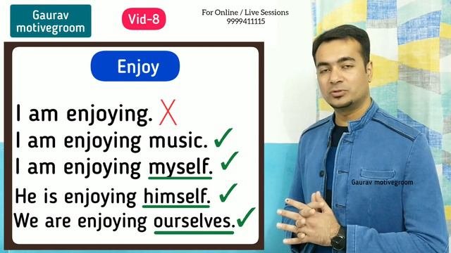 Books Buy Links: Oxford Dictionary (with App) - https://amzn.to/2SgZAKj Oxford English-Hindi Dictionary - https://amzn.to/3bIoQA4 Cambridge Grammar Book - https://amzn.to/3hCLtKa Idioms Dictionary - https://amzn.to/2ShS9Tu ---------------------------------------------------------------- Greetings ! This video is very useful for English speakers as generally the verb ENJOY is not used correctly. Having watched this video you will be aware of the correct use of this verb. Not only this but a lot is kept for you further on Personality Grooming Tips & Motivation. If one wants a videos on a particular topic, they can express their desire the comments & It would be definitely considered. Our MOTIVE must be to GROOM. This channel 'Gaurav Motivegroom' is all about: #Motivation. #Personality Grooming. #English Language Skills. - - - - - - - - - - - - - - - - - - - - - - - - - - Follow 'Gaurav motivegroom' id on all social media for short vids:- Instragram - https://www.instagram.com/gauravmotivegroom Tiktok - https://www.tiktok.com/@gauravmotivegroom Facebook - https://www.facebook.com/gauravmotivegroom Helo - http://m.helo-app.com/al/QdcUNvpSF - - - - - - - - - - - - - - - - - - - - - - - - - - For Online / Live Sessions on Motivation, Personality Grooming & English Contact / WhatsApp @ 9999411115.