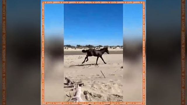 Полугодовалый жеребёнок впервые увидел море.