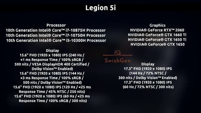 Lenovo Launched there new Legion laptops those are Lenovo Legion 7i, 5i, and also a Legion 5 with AMD Ryzen 4000 Processor. Sorry, Guys, I made a mistake on this video the Legion 7i Price in USD is $1599 in INR it's around ₹1,23,000... Once again sorry for wrong information...:( In India 7i Starts at Rs.1,60,0000 Facebook Page - https://www.facebook.com/SwishGen Instagram Page - https://www.instagram.com/swishgen Lenovo Legion 7i Full Specification - Processor 10th Generation Intel Core i9-10980HK Processor 10th Generation Intel Core i7-10875H Processor 10th Generation Intel Core i7-10750H Processor 10th Generation Intel Core i5-10300H Processor Graphics - NVIDIA GeForce RTX 2080 Super Max-Q NVIDIA GeForce RTX 2070 Super Max-Q NVIDIA GeForce RTX 2070 NVIDIA GeForce RTX 2060 NVIDIA GeForce GTX 1660 Ti Display - 15.6" FHD (1920 x 1080) IPS (240 Hz / 1 ms Response Time / 100% Adobe sRGB / 500 nits / VESA DisplayHDR 400 Certified / Dolby Vision™ Enabled / NVIDIA G-Sync) 15.6" FHD (1920 x 1080) IPS (144 Hz / 3 ms Response Time / 100% Adobe sRGB / 500 nits / VESA DisplayHDR 400 Certified / Dolby Vision™ Enabled / NVIDIA G-Sync) 15.6" FHD (1920 x 1080) IPS (144 Hz / 3 ms Response Time / 100% Adobe sRGB / 300 nits) Backlit Keyboard - Corsair iCUE RGB Support Webcam - Built-in HD Webcam (720p) Memory - DDR4 :8 GB / 16 GB / 32 GB Storage - PCIe SSD : 256 GB / 512 GB / 1 TB Intel Optane H10: 512 GB + 32 GB / 1 TB + 32 GB with SSD Support Audio 2 x 2W Dolby Atmos Speaker System for Gaming with Chamber Battery - ~8 Hours (80 Wh; 4 Cells) Lenovo Legion 5i Full Specification - Processor - 10th Generation Intel Core i7-10875H Processor 10th Generation Intel Core i7-10750H Processor 10th Generation Intel Core i5-10300H Processor Graphics - NVIDIA GeForce RTX 2060 NVIDIA GeForce GTX 1660 Ti NVIDIA GeForce GTX 1650 Ti NVIDIA GeForce GTX 1650 Display - 15.6" FHD (1920 x 1080) IPS (240 Hz / 1 ms Response Time / 100% sRGB / 500 nits / VESA DisplayHDR 400 Certified / Dolby Vision™ Enabled) 15.6" FHD (1920 x 1080) IPS (144 Hz / 3 ms Response Time / 100% sRGB / 500 nits / Dolby Vision™ Enabled) 15.6" FHD (1920 x 1080) IPS (120 Hz / 25 ms Response Time / 45% NTSC / 250 nits) 15.6" FHD (1920 x 1080) IPS (60 Hz / 25 ms Response Time / 100% sRGB / 300 nits) Display - 17.3" FHD (1920 x 1080) IPS (144 Hz / 72% NTSC / 300 nits / Dolby Vision™ Enabled) 17.3" FHD (1920 x 1080) IPS (60 Hz / 72% NTSC / 300 nits) Memory - DDR4 : 8 GB / 16 GB Storage - PCIe SSD¹: 128 GB / 256 GB / 512 GB / 1 TB HDD : 5400 RMP / 2.5" 1 TB; 7200 RPM / 2.5" 1 TB Battery - ~5 Hours (80 Wh; 4 Cells) ~5 Hours (60 Wh; 4 Cells) Weight - Starting at 2.5 kg (5.51 lbs) Backlit Keyboard White Backlight / 4-Zone RGB Backlight Lenovo Legion 5 With AMD - Processor AMD Ryzen 7 4800H Mobile Processor AMD Ryzen 5 4600H Mobile Processor Graphics NVIDIA GeForce RTX 2060 Display 15.6" FHD (1920 x 1080) IPS (144 Hz / 3 ms Response Time / 100% sRGB / 300 nits / VESA DisplayHDR 400 Certified / Dolby Vision™ Enabled) 15.6" FHD (1920 x 1080) IPS (120 Hz / 25 ms Response Time / 45% NTSC / 300 nits) 15.6" FHD (1920 x 1080) IPS (60 Hz / 25 ms Response Time / 100% sRGB / 300 nits) Memory DDR4 : 8 GB / 16 GB; 3200 MHz Storage PCIe SSD1 :128 GB / 256 GB / 512 GB / 1 TB HDD :5400 RPM / 2.5" 1 TB; 7200 RPM / 2.5” 1 TB Battery ~5 Hours (80 Wh; 4 Cells) Thanks For Watching.....Don't Forget Like the Video & also Hit The SUBSCRIBE Button For More videos like this ;) What's on this video - Lenovo Legion 7i, 5i & Legion 5 with AMD 4000 Coming in India | Full Specification & Price | Hindi Lenovo Legion 7i full Specification Lenovo Legion 5i full Specification Lenovo Legion 5 full Specification Lenovo New AMD Ryzen 4000 Processors laptop Lenovo Legion 7i, 5i, 5 full review in Hindi Lenovo Legions 7i, 5i, 5 India launch date Lenovo Legions 7i, 5i, 5 Price in India Background Audio Credit : Ikson - Do it (Official)