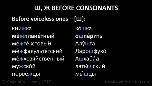 Russian Pronunciation. Ш, Ж before Consonants. Russian Lessons Online with Yevgeni Yeliseyev. Sign up for a FREE Skype lesson here: http://russianwithrussian.com/signup.php #russianlessons Other videos about Russian pronunciation: https://www.youtube.com/playlist?list=PL4FoGAk797pPfy9yJiCmCCMW01gDJRt1k ----------------------------------------- In our channel (russianwithrussian) you will find free Russian lessons prepared by a native Russian tutor (Yevgeni Yeliseyev). Here you will find a lot of necessary information for Russian language learners: – Russian alphabet, – features of Russian pronunciation, – Russian grammar (nouns, pronouns and Russian verb conjugation; formation of the Present and Future Simple Tenses will be examined in detail). New videos are usually published on Thursdays at 10 pm Moscow time. ----------------------------------------- If you have any questions or doubts, feel free to CONTACT ME: – Email: [email protected] – facebook: https://www.facebook.com/yevgeniy.yeliseyev – group: https://www.facebook.com/groups/russianwithrussian