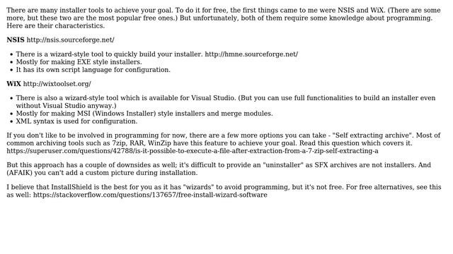 How can I create an installer? Helpful? Please support me on Patreon: https://www.patreon.com/roelvandepaar With thanks & praise to God, and with thanks to the many people who have made this project possible! | Content (except music & images) licensed under cc by-sa 3.0 | Music: https://www.bensound.com/royalty-free-music | Images: https://stocksnap.io/license & others | With thanks to user Scott Rhee (https://superuser.com/users/303230), user Keltari (https://superuser.com/users/94133), user farosch (https://superuser.com/users/440496), user CodeIt (https://superuser.com/users/383350), and the Stack Exchange Network (http://superuser.com/questions/907862). Trademarks are property of their respective owners. Disclaimer: All information is provided "AS IS" without warranty of any kind. You are responsible for your own actions. Please contact me if anything is amiss at Roel D.OT VandePaar A.T gmail.com.
