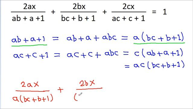 A Very Nice Algebra Problem Find the value of x : abc = 1 2ax/(ab+a+1) +2bx/(bc+b+1) + 2cx/(ac+c+1) = 1