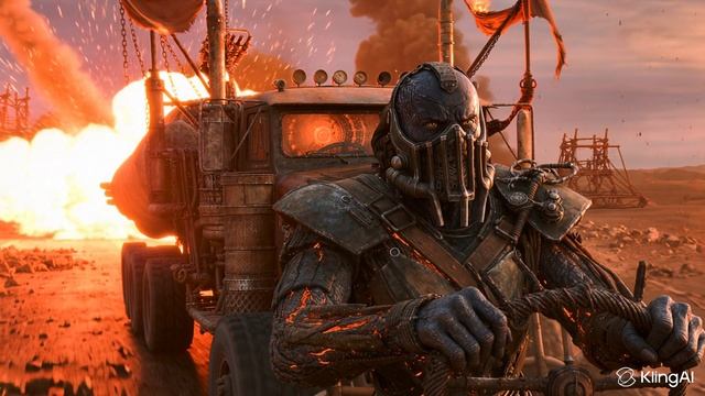 Персонаж в тяжелой броне ведет потрепанную в боях машину по пустынной местности, решительно сжимая руль, в то время как камера следит за движением машины. Вдалеке рушатся разрушающиеся строения, в то время как огненные взрывы освещают пыльный горизонт, а самодельное вооружение машины гремит при каждом ударе о потрескавшуюся поверхность. #безумныймакс #машина #взрыв #пыль #дорога