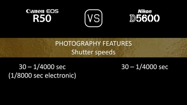 This video overviews the Canon EOS R50 and the Nikon D5600 in a parallel comparison of specifications. Thanks for watching. If you liked this video and found it informative, make sure to subscribe for more. 00:24 LAUNCH 00:32 BODY 00:41 SENSOR 01:05 IMAGE 01:21 OPTICS & FOCUS 01:50 SCREEN 02:10 VIEWFINDER 02:26 PHOTOGRAPHY FEATURES 03:27 VIDEOGRAPHY FEATURES 03:43 STORAGE 03:47 CONNECTIVITY 04:16 PHYSICAL 04:36 MISC
