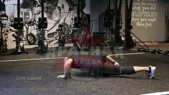Исходное положение - упор лёжа. Начиная упражнение, игрок максимально продвигает вперёд одну руку, как бы делая ею широкий шаг, и одновременно подводит к противоположной руке, оставшейся на месте, ногу, ставя её на носок ступни и подводя колено к локтю руки. выполнив эти движения, спортсмен сгибает в локте опорную руку, выполняя "отжимание". Далее следует "шаг" второй рукой и второй ногой, с обязательным отжиманием по выполнению шага, замыкая полный цикл двигательной задачи. Особое внимание следует обратить на положение спины. На протяжение всего упражнения она остаётся ровной, не прогнутой. В одном повторении 8 шагов, каждый из которых осуществляется на счёт 4 . Пауза отдыха между повторениями - 15 секунд. В одном подходе 4 повторения. На один подход приходится 32 шага. Пауза отдыха между подходами - 60 секунд. В упражнении 2 подхода.