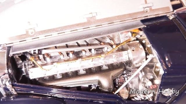 Hand-assembled precision model composed of over 1,780 single parts Authentically formed and true-to-scale body, built after the contemporary appearance of the car found in John Mozart’s collection Precisely replicated frame made of metal Fully functional double-wing engine hood. The wings open to rest on specially-mounted metal buttons True-to-the-original replication of the front with beautifully-integrated head lamps Perfectly replicated radiator grille and functional metal radiator cap in a chrome finish Rear wheels covers with “half-moon” metal tabs Functional driver and passenger doors with finely-made hinges Highly detailed 8-cylinder in-line engine with all aggregates, pipes, and cabling Perfectly spoked wheels and two-wing central locking nuts with right- or left-hand threat for the release of the wheels Removable spare wheel in the trunk after the toggle screw is released Trunk lid is lockable A miniature version of the car jack, air-pump, grease gun and toolkit is enclosed in the trunk Finely replicated dashboard with all instruments and controls Elaborate underbody with an exhaust system of stainless steel High-quality paintwork with an excellent finish