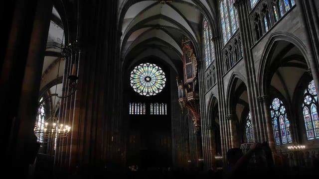 Кафедральный собор в Страсбурге - один из шедевров готической архитектуры, бывший на протяжении 200 лет самым высоким зданием мира. Строительство собора, начавшееся в 1015 году, завершилось лишь в 1439. Северная башня собора достигает высоты 142 метра. Потрясающие витражи наполняют внутреннее пространство мерцающим светом, производящим незабываемое впечатление на посетителей. Основным декоративным элементом является круглое окно-роза, созданное между 1320 и 1340 годами. Подобные солнечным, лучи жёлтого стекла расходятся в разные стороны, окружённые мозаикой из зелёных и синих фрагментов и небольшими глазками с красными цветочными узорами. В нижнем ярусе с южной стороны находятся витражи с изображением Страшного суда, а в окнах верхнего яруса изображены двенадцать эпизодов из Книги Бытия, в том числе сотворение Адама и Евы, сцена первородного греха, изгнание из Рая и Ноев ковчег. Эти витражи датируются примерно 1345 годом. В пяти нижних нишах с северной стороны находятся одни из самых старых витражей собора, установленные в старом романском соборе примерно в 1180 году. Когда в XIII веке неф был перестроен в готическом стиле, окна были установлены в произвольном порядке. В 1877 году архитектор Гюстав Клотц восстановил их первоначальное расположении. Витражи посвящены девяти императорам Священной Римской империи. На круглых окнах над головами императоров изображены сцены из жизни Христа. Два нижних стрельчатых окна северного трансепта были собраны в XIX веке из стёкол разных веков. На них изображены Древо Иессея (Генеалогия Христа) и суд Соломона (правое окно) и Дева Мария с Иоанном Крестителем и Иоанном Евангелистом, а также царь Соломон, царица Савская и царь Давид слева. Ещё два окна с растительным орнаментом наверху созданы позже, в XIV веке. На восточной стене окна изображают Христа, Святого Лаврентия, Деву с Младенцем и Иоанна Крестителя. Капители колонн украшены изображениями драконов и других мифических существ. Круглые окна-розетки на фасаде западного трансепта датируются приблизительно 1230-1235 годами. Над ними расположены круглые окна меньшего диаметра с изображением библейских символов. Ещё одной достопримечательностью собора являются уникальные астрономические часы 1832 года, показывающие орбиты Земли, Луны и всех известных планет - от Меркурия до Сатурна.