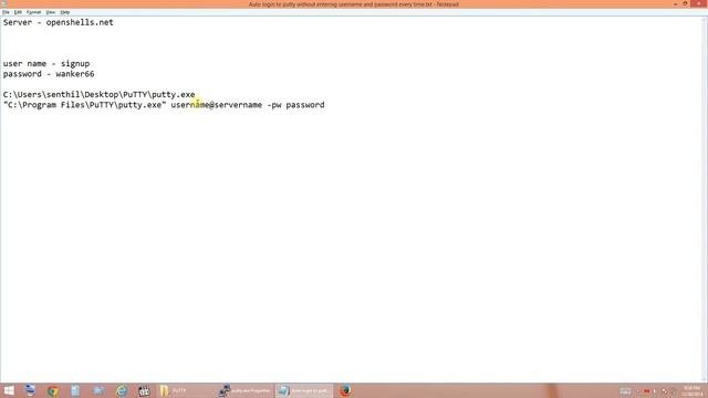 This video will help you with the below needs: Auto login to PuTTY without entering password every time Auto login to PuTTY with pre-configured username and password Auto login to PuTTY with pre-saved username and password How to Auto Login into Putty with Saved Password Auto login to PuTTY without keying username and password Syntax of the string to be placed in Shortcut Target: "Path of putty.exe" Userid@servername -pw password Example of the string to be placed in Shortcut Target: “C:\Users\senthil\Desktop\PuTTY\putty.exe” [email protected] -pw wanker66