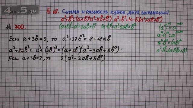 "Подписывайтесь на канал - https://www.youtube.com/channel/UC3qzAZZ51xvl9foham7WIMg/ Плейлист: § 18. Сумма и разность кубов двух выражений (675-708) – ГДЗ Алгебра 7 класс – Мерзляк А.Г., Полонский В.Б., Якир М.С. - https://www.youtube.com/playlist?list=PLrGjsASQldRyQK5jLu1JurbcSspNiQMeU Задание № 700 – ГДЗ Алгебра 7 класс – Мерзляк А.Г., Полонский В.Б., Якир М.С. Наша группа ВК: ГДЗ Математика Алгебра - https://vk.com/4da5ru Рассказывайте о нас друзьям, делитесь нашими видео в социальных сетях. Ставьте лайки и подписывайтесь."