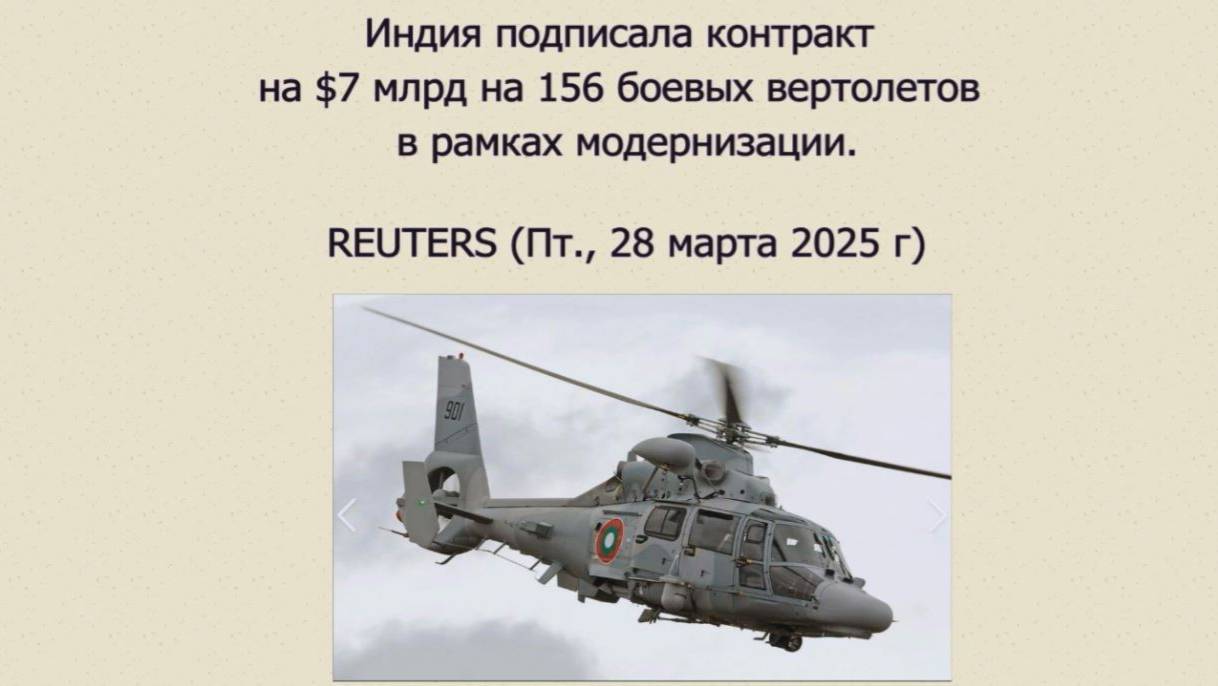 Индия купит 156 боевых вертолетов для своих военно-воздушных сил и армии на сумму более $7,3 млрд, сообщило в пятницу министерство обороны, что стало одной из крупнейших покупок в этом финансовом году в рамках стремления страны модернизировать свои вооруженные силы