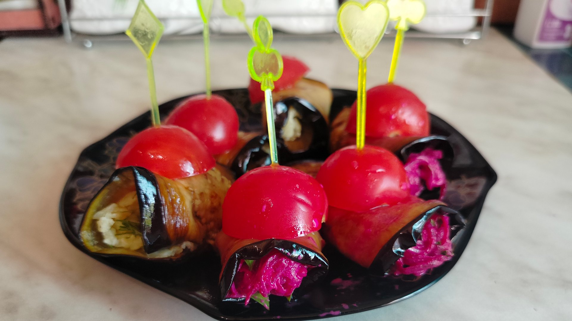 Закуска сытная, рулетики из баклажан с необычными начинками