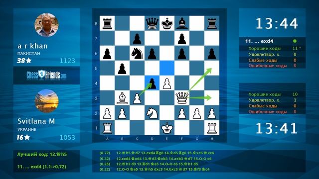 Данное видео было создано мобильным приложением ChessFriends.com **** Понравилось видео? Вы тоже можете создавать такие видео! Просто установите наше приложение, играйте и экспортируйте игры прямо в YouTube. Android: https://play.google.com/store/apps/details?id=chessfriends.online.chess iOS: https://itunes.apple.com/app/chess-online-+/id903978215?mt=8 Windows 8/10: http://apps.microsoft.com/windows/app/ajedrez-online/362ae1c9-5d6f-4824-a9e7-1095b2a95e10 OSX: https://itunes.apple.com/app/chess-online-+/id919607238?l=en&mt=12 Мобильный сайт: http://www.chessfriends.com/mobile?lang=ru_RU Facebook App: https://apps.facebook.com/chessfriendscom Windows Phone: http://apps.microsoft.com/windows/app/ajedrez-online/362ae1c9-5d6f-4824-a9e7-1095b2a95e10 **** Chess Age: Android: https://play.google.com/store/apps/details?id=chess.friends.game.play IOS: https://itunes.apple.com/us/app/chess-age/id1217007613?mt=8 Facebook: https://apps.facebook.com/chessage **** Подпишитесь на ChessFriends.com в YouTube: https://www.youtube.com/subscription_center?add_user=ChessFriendsDotCom Facebook: https://www.facebook.com/ChessFriendscom-127961610576613/?fref=ts **** Игра в формате PGN: [Event "free game"] [Site "www.chessfriends.com"] [Date "2023/4/20"] [Round "none"] [White "Svitlana M"] [Black "a r khan"] [Result "0-1"] [ECO "C44"] [Opening "Scotch Game"] [WhiteElo "1053"] [BlackElo "1123"] [WhiteCountry "UA"] [BlackCountry "PK"] [TimeControl "900000"] 1. e4 e5 2. Nf3 Nc6 3. d4 d6 4. c3 Nf6 5. Bb5 Bg4 6. Bg5 Bxf3 7. Qxf3 h6 8. Bxf6 gxf6 9. Nd2 a6 10. Ba4 b5 11. Bb3 exd4 12. cxd4 Nxd4 13. Qd3 Nxb3 14. Nxb3 Bg7 15. Na5 O-O 16. Nb7 Qe7 17. O-O-O c5 18. Na5 f5 19. Nc6 Qf6 20. exf5 Qxb2# 0-1
