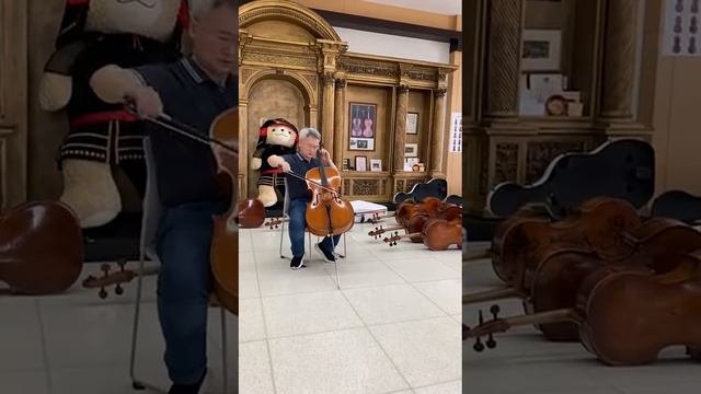 Jian Wang testing, comparing great Cellos. C. Bergonzi