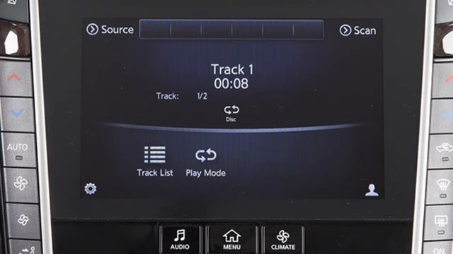 "This video is copyrighted material of Nissan North America, Inc. and should not be copied, edited, or reproduced without the permission of Nissan. The steering wheel audio controls are located on the left side of the steering wheel. This switch adjusts the volume up or down. Push this switch up or down for less than 1.5 seconds to move through the saved presets. Push and hold the switch up or down for more than 1.5 seconds to seek the next or previous station or channel when in the AM, FM or SiriusXM® Satellite Radio mode. When in CD, USB or Bluetooth streaming audio mode, push the switch up or down to select the next or previous track, or, if available, push and hold up or down for 1.5 seconds to navigate through folders on the audio device. Push the switch up or down to seek the next or previous track when in iPod® mode. Press the BACK button to return to the previous screen. Please see your INFINITI InTouch Owner’s Manual for important safety information, system limitations and additional operating information. "