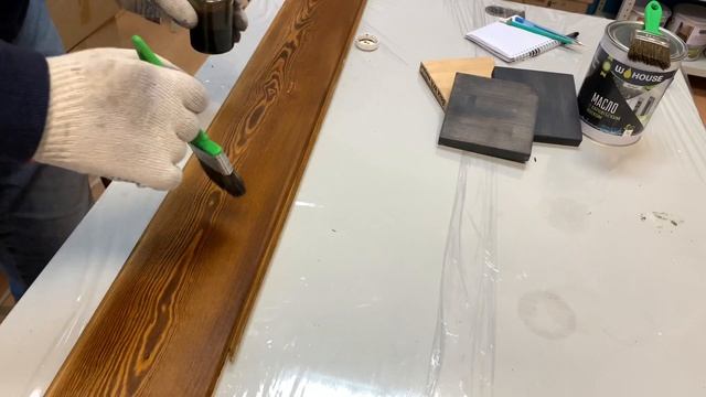 Нанесение бейца W.House, цвет мореный дуб, на лиственницу. Тонируем древесину.