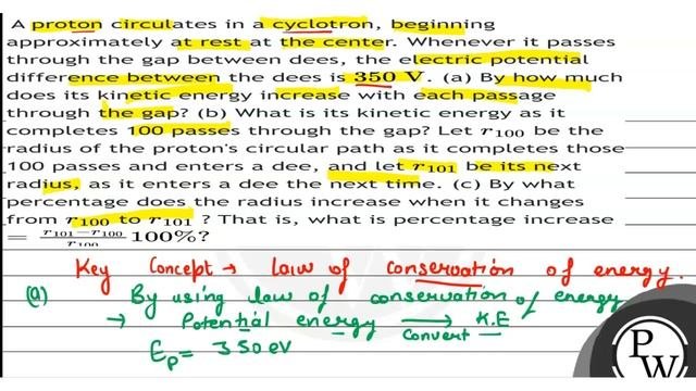 A proton circulates in a cyclotron, beginning approximately at rest at the center. Whenever it passes through the gap between dees, the electric potential difference between the dees is \( 350 \mathrm{~V} \). (a) By how much does its kinetic energy increase with each passage through the gap? (b) What is its kinetic energy as it completes 100 passes through the gap? Let \( r_{100} \) be the radius of the proton's circular path as it completes those 100 passes and enters a dee, and let \( r_{101} \) be its next radius, as it enters a dee the next time. (c) By what percentage does the radius increase when it changes from \( r_{100} \) to \( r_{101} \) ? That is, what is percentage increase \( =\frac{r_{101}-r_{100}}{r_{100}} 100 \% ? \) 📲PW App Link - https://bit.ly/YTAI_PWAP 🌐PW Website - https://www.pw.live