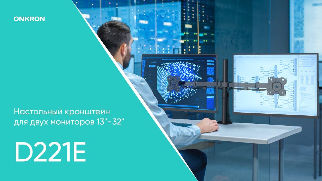 Компания ONKRON представляет настольный кронштейн для крепления двух мониторов ONKRON D221E. Это незаменимый инструмент для оптимальной организации рабочего места в офисе или дома. D221E совместим со всеми мониторами и ТВ диагональю от 13 до 32 дюймов и весом до 8 кг. Такой кронштейн поможет существенно повысить производительность, он незаменим в работе дизайнеров, проектировщиков, программистов, архитекторов, верстальщиков и множества других специалистов. Он позволяет не только надежно закрепить экран, но и управлять им во всех плоскостях благодаря механизму с газовой пружиной. Вертикально перемещая монитор, наклоняя, поворачивая, меняя расстояние от основания и ориентацию экрана с альбомной на портретную, вы не только обеспечиваете себе максимально комфортную работу, но и существенно снижаете нагрузку с позвоночника. Встроенный кабель-канал и система организации проводов и ключей позволят скрыть провода и придать аккуратный внешний вид вашему рабочему месту. D221E имеет возможность лёгкой установки на столешницу двумя способами: - При помощи струбцины (включен в комплект) - Или механизм крепления через отверстие в столешнице (включен в комплект) Модель совместима с экранами со стандартами VESA 75х75 и 100х100 мм. Описание бренда Компания ONKRON – это крупнейший международный производитель кронштейнов для ТВ, мониторов и мобильных стоек. Также в ассортименте компании есть товары для дома и аксессуары для бытовой техники, делающие домашнюю среду более комфортной. Вместе с ONKRON вы получите очевидную выгоду и удобство. Мы предлагаем: • высококачественный и функциональный продукт, • техническую и информационную поддержку. _________________________________________ Нашу продукцию можно приобрести наиболее удобным для Вас способом на следующих ресурсах: OZON: https://www.ozon.ru/product/onkron-kronshteyn-dlya-dvuh-monitorov-13-32-nastolnyy-chernyy-d221e-podstavka-pod-monitor-2-po-8-kg-151621474 Yandex Market: https://market.yandex.ru/store--onkron/product/461476395?businessId=687091&sku=100663028864 Wildberries: https://www.wildberries.ru/catalog/8037864/detail.aspx?targetUrl=SP Мегамаркет: https://sbermegamarket.ru/shop/onkron-so-sklada-sbermegamarket/catalog/kronshtejny-i-stojki-dlya-televizorov/ M.video: https://www.mvideo.ru/products/kronshtein-dlya-monitora-onkron-d221e-400052917 Магнит Маркет:https://mm.ru/product/kronshtejn-dlya-dvukh-2978283?skuId=8372128 Lemana Pro: https://spb.lemanapro.ru/brands/onkron Официальный сайт: https://shop.onkron.ru/product/onkron-kronshtejn-dlja-dvuh-monitorov-10-32-nastolnyj-chjornyj-d221e-new