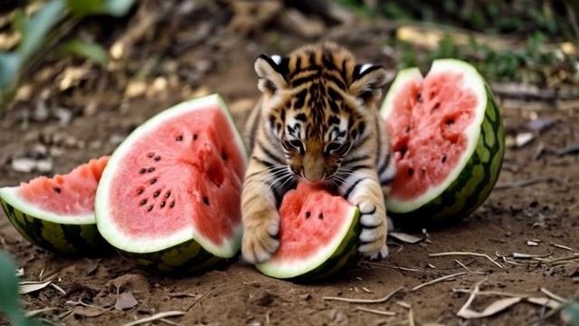 Тигренок кушает арбуз