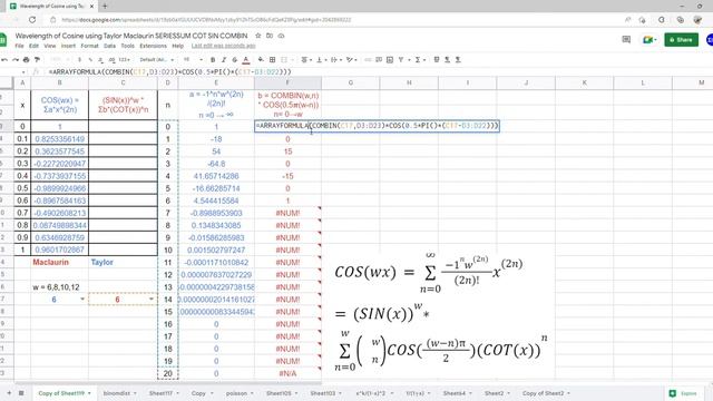 This video shows the use of ARRAYFROMULA, DATA VALIDATION, SERIESSUM, COMBIN, COS, COT, SIN, FACT functions of Google Sheets and Excel to vary the wavelength of Cosine through its Taylor Series and Maclaurin Series Expansion.