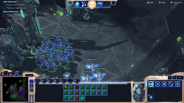 This is part of a playthrough of the Starcraft2 Legacy of the void campaign without using the spear of adun, unit upgrades such as Dragoons, on the Brutal difficulty along with completing all bonus objectives for an extra challenge. This is without using the Master's Archive, because it won't allow me to unpick my upgraded units. I thought this would be cake... boy was I wrong. It probably took me the most attempts out of every mission so far. You have 24mins 50 seconds to complete this mission before the swarm gets wiped out. I completed it with 24min 30sec... The problem is that the void crystals have some serious backup, especially the last 2. You need to do a lot of hit and run with stalkers. Once again, since this is a timed mission, you need to push as fast as possible, using stakers to hit and run a bit. I used mostly stalkers, immortals, sentries, high templar and phoenixes. Stalkers are great for hit and runs, immortals destroys the hybrid waves that spawns after you kill your 2nd and 3rd crystal, high templars are only used for feedback to remove the massive damage dominators do and to get rid of units instantly. Phoenixes are probably not necessary, but they are free stuns and the first few groups have little units, and it gets rid of immortals for a few seconds which means i probably lost 10 less stalkers during the mission. Sentries are used on excess gas but you do want some to have some staying power for the last crystal. First crystal is cake, use feedback on everything you can, wait until the zerg attacks, just hit and run with stalkers. You attack the second crystal when kerrigan goes for it, have her and her ultralisk tank as much as possible, make sure you lose nothing. You shouldn't be able to pierce through with kerrigan so take your time after, there is no rush. 3rd Crystal you'll want to hit and run as much as you can without losing units: this base is too well equipped and running into it straight means youll lose a lot of units. Carriers and voidrays will kill stalkers quickly 1 by 1 so kill them quickly. 4th crystal is the toughest one. You want to push with kerrigan and have her tank the damage and seeker missiles. If you didn't do well on the mission, you won't have enough units to pierce through there. Make sure to use a lot of feedback on thors spectres battlecruisers... Immortals will shine there as theres a lot of armored units. I hold back on killing the 2nd crystal because killing the 2nd and 3rd crystal spawns a wave of hybrids, which you want to be prepared for and lose few units. I figure after this mission it will only get easier for the next few, as I'll be doing the Taldarim missions next and getting voidrays. Voidrays are so strong for the campaign it's ridiculous, since the enemy does not adapt to flying units.