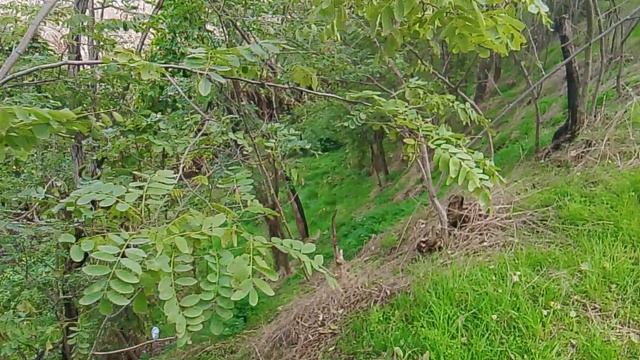Лесистый склон холма На переднем плане видна трава, которая местами сухая, а местами зелёная.