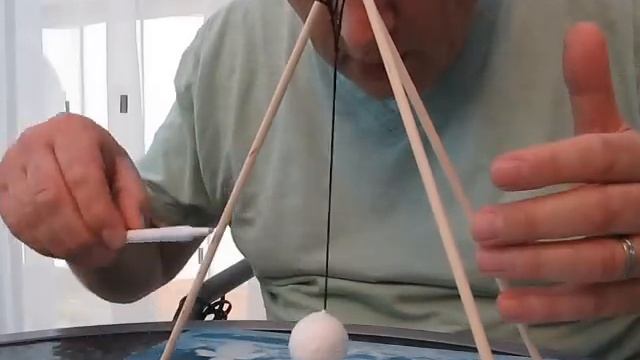 Psychic pendulum - a Polystyrene ball hung from a string is moved by the mind. a pen is moved around the ball to show no hidden wires and a lid is put between the Magician and the ball to show, to ball is not blown by mouth