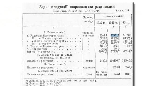 В ролике приведены данные по динамике поголовья скота в УССР и Киевской области за 1928 - 1934 года. В мае 1932 года - 957,8 тысяч голов крупного рогатого скота, В мае 1933 года - 864,5 тысяч голов крупного рогатого скота. В мае 1934 года - 974,0 тысяч голов крупного рогатого скота. Интересны также данные про сдачу мяса, молока, и яиц в 1932-1934 годах. Согласно таблице 114 (стр. 285 данного справочника) совхозами УССР за 1932 год было сдано 26606,2 тонны мяса и 2109,1 тонны молока и масла; за 1933 год - 37836,7 тонны мяса и 100836,7 тонн молока и масла; а за 1934 – 43154 тонны мяса и 134089 тонн молока Допустим в 1932 году коммунисты забрали всех коров и съели всех свиней, овец, котов, собак и прочую живность и из-за этого случился великий голод. Но что тогда сдавали в следующем году? Откуда взялись 37836 тонн мяса сданные в 1933 году? Откуда появились тысячи голов скота, который пустили на забой в 1934 году? Некоторое обсуждение данной темы проходило вот здесь https://pikabu.ru/story/skazka_pro_golodomor_kievskaya_oblast_perechen_postov_8162277?utm_source=linkshare&utm_medium=sharing Полную версию "Сказка про Голодомор. Киевская область" скачать можно отсюда https://drive.google.com/file/d/1iBc_ckvXkAxX8sY1StlWdUzuJbMOT-c5/view
