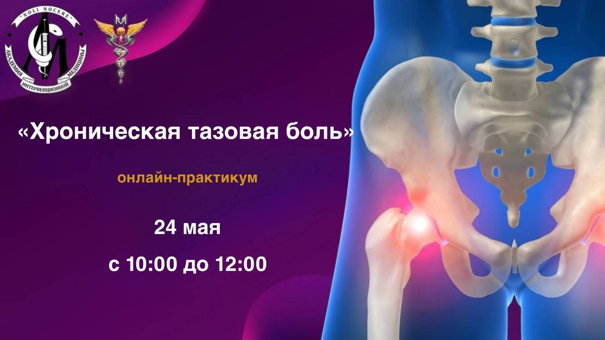 Онлайн-практикум Академии Интервенционной Медицины под эгидой Союза Ассоциаций "Медицина, основанная на здравомыслии" и Межрегиональной Ассоциации Специалистов Паллиативной и Интервенционной Медицины (МАСПИМ): «Оттачивая мастерство: хроническая тазовая боль» для врачей лечебных специальностей ПРОГРАММА ПРАКТИКУМА 10.00 - 10.40 Диагностика и лечение СХТБ в неврологической практике: действующие клинические рекомендации. Алексей Николаевич Баринов, к.м.н., заведующий кафедрой неврологии и психотерапии медицинской академии МЕДСИ, председатель Межрегиональной Ассоциации Специалистов Паллиативной и Интервенционной медицины (МАСПИМ), президент союза «Медицина, основанная на Здравомыслии». 10.40 - 11.20 Малоинвазивное лечение тазовой боли. Шумовский Владимир Константинович, нейрохирург, врач высшей квалификационной категории, Клиническая больница МЕДСИ в Отрадном / Клиника МЕДСИ в Отрадном (на базе клинической больницы). 11.20 -12.00 Эмоциональные аспекты СХТБ: о чем сжимается промежность? Алексей Николаевич Баринов, к.м.н., заведующий кафедрой неврологии и психотерапии медицинской академии МЕДСИ, председатель Межрегиональной Ассоциации Специалистов Паллиативной и Интервенционной медицины (МАСПИМ), президент союза «Медицина, основанная на Здравомыслии». 12.00 Обсуждение, ответы на вопросы